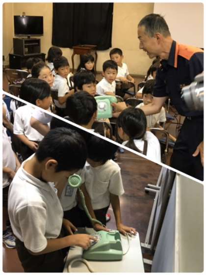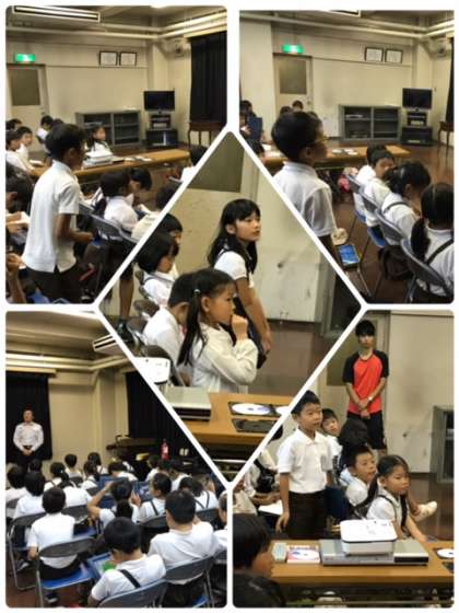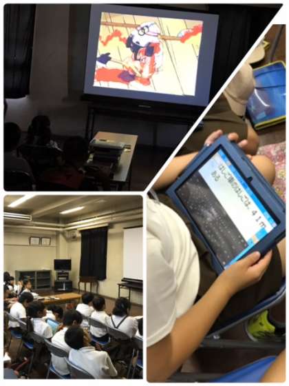 消火器体験の後は、室内ホールでビデオを見て学習し、その後質疑応答で4年生はどちらのクラスも、消防のことについて関心をもって聞いていました。