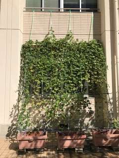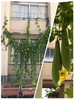 9月になりました。この夏の成果として、緑のカーテンとして取り組んでいる、ヘチマとひょうたんが順調に成長しています。