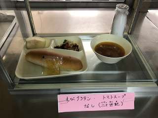 エビグラタン、トマトスープ、梨、パン、牛乳