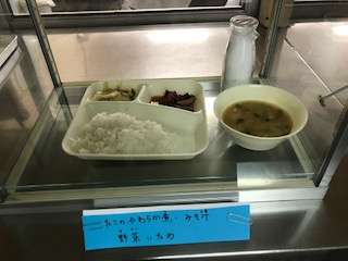 たこのやわらか煮、野菜いため、味噌汁、ご飯、牛乳