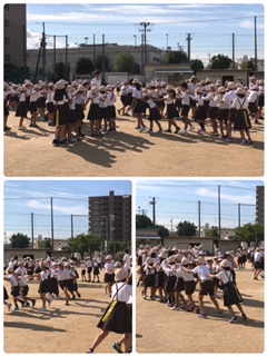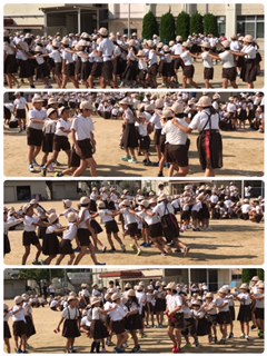 13日、今日の集会は、ムカデしっぽ取りをしました。グループが離れないよう、しっかり肩を持って、しっぽ取りに挑戦しました。