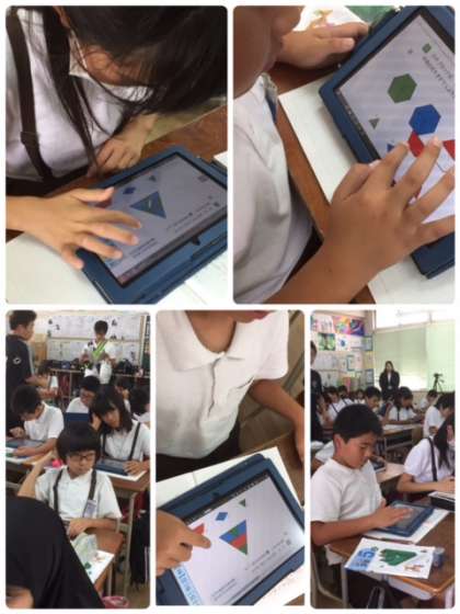 > 5年生は数学的な考え方を使って、ブロックを組み合わせて、いろいろな図形を作ることがでしました。