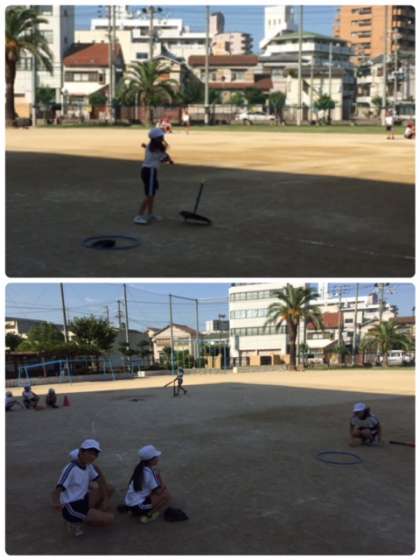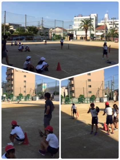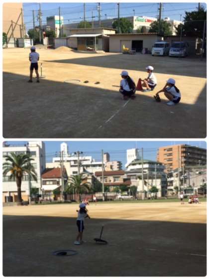 5時間目に1組が、6時間目に2組がティーボールをしています。