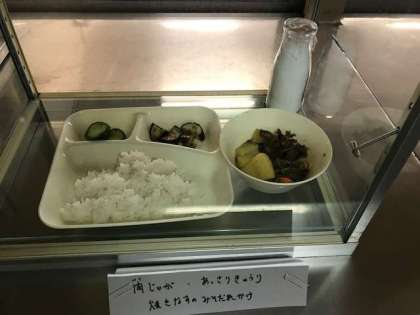 肉じゃが、あっさりきゅうり、焼きなすの味噌だれかけ、ご飯、牛乳