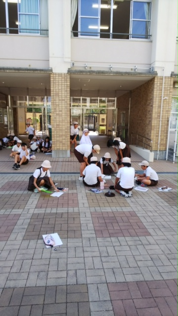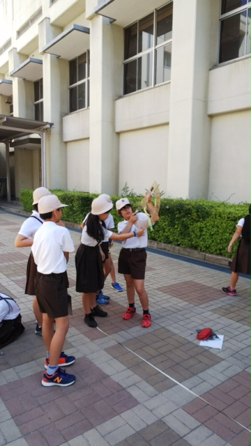 > 縮図を使って校舎の高さをはかっています。45度に見える位置からだと縮図がいらないことも発見しました。
