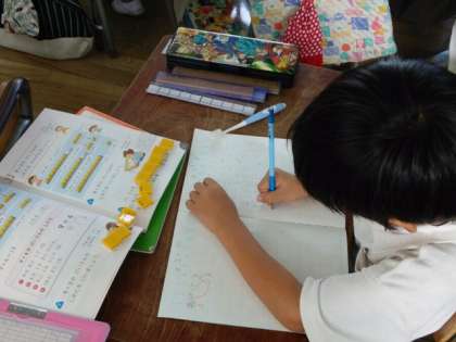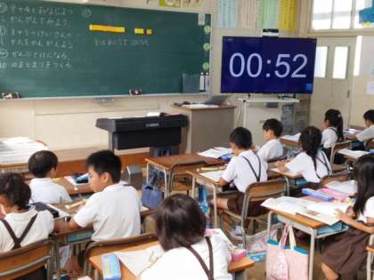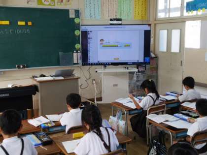1年生は算数で、くり上がりの足し算の学習です。ブロックを使ったり、デジタル教科書を提示したりしながら、授業が行われています。