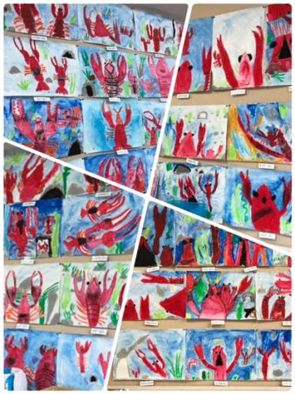 教室の背面には、いきいきとしたザリガニの絵が掲示されていました。児童それぞれが思いをもってうまく表現しています。