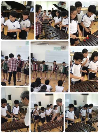また、スネアドラムやアコーディオンの体験は各クラスの代表2名ずつが行いました。