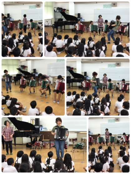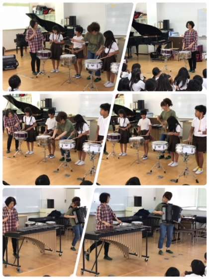 全員で木琴のトレモロ奏体験。その後各クラスの代表が、アコーディオンやスネアドラムの体験もさせていただきました。