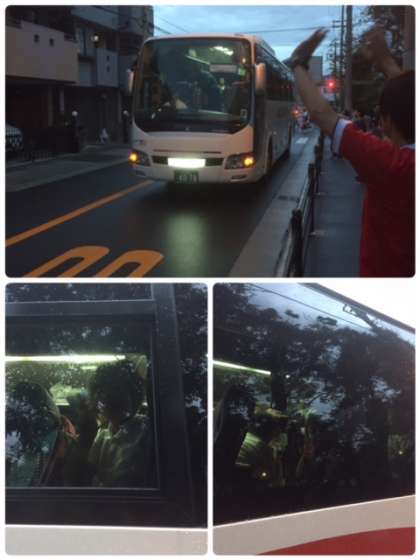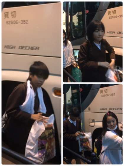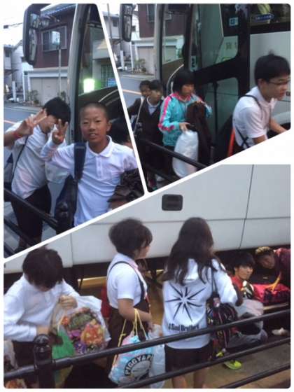 6年生が修学旅行から帰ってきました。帰校式は講堂で行います。