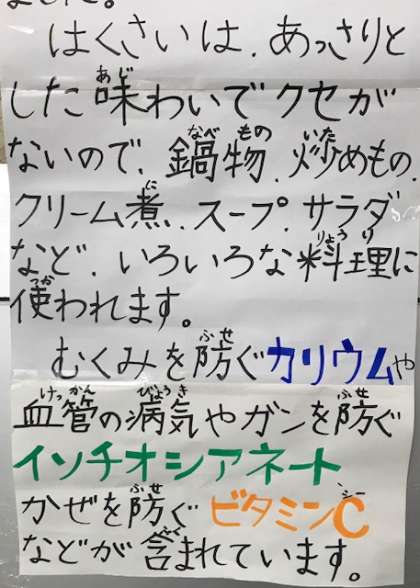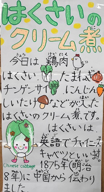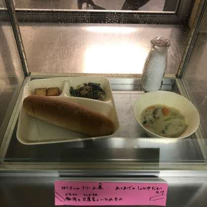 はくさいのクリーム煮、あつあげのしょうゆだれかけ、こくとうパン、豚肉と三度豆のいためもの、牛乳です。