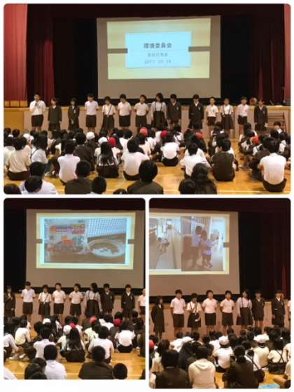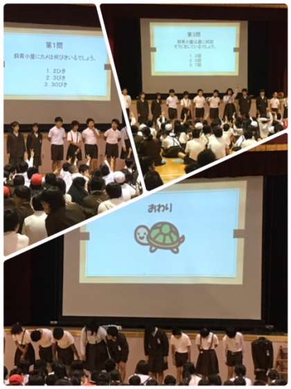 今日のなかよし集会は、環境委員会の発表でした。飼育栽培編と美化編の2つの発表の後、三択クイズを行いました。