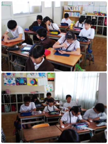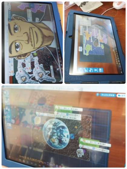 タブレットを使って自由にプログラムを作っています。おしゃべりさえ忘れて、夢中です。使い方は体験的に覚えていきますので、先生は何一つ教えていません。それでもたちまちステキな動画が仕上がっています。