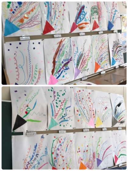 1年生の教室の後ろの掲示板には、パスで描いたクラッカーの絵が掲示されています。参観の時にぜひご鑑賞ください。