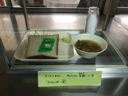 担々麺、キャベツの甘酢づけ、さくらんぼ、食パン、牛乳
