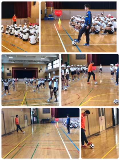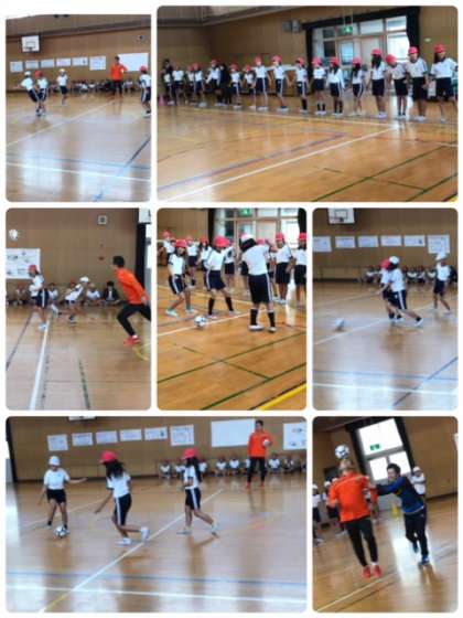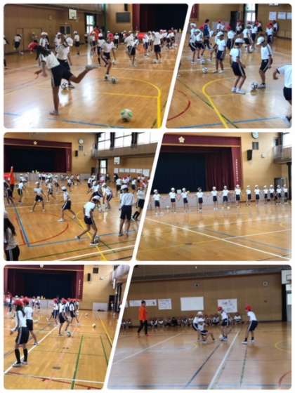 19日、トップアスリート事業として、シュライカー大阪の方が来校し、フットサルの楽しい授業をしてくださいました。2時間目、まずは5年生が体験しました。ボールに慣れることから始まり、最後は組対抗で試合をしました。