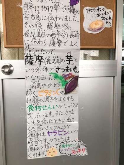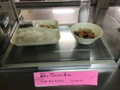 豚肉と一口がんもの煮物、サツマイモの天ぷら、ミニフィッシュ、ご飯、牛乳