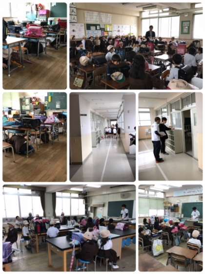 3時間目、子どもたちは、地震の避難訓練、津波の避難訓練、その後地区別に分かれ、引き渡し訓練をしました。本来ならば一度運動場に避難するのですが、雨のため今日はそのまま津波に備えて三階に避難しました。その後荷物を取りに戻り地区別の教室に移動しました。