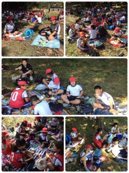 先生方も一緒にお弁当を食べています。子どもたちはたくさん歩いたし、お弁当がおいしいので、もりもり食べています。