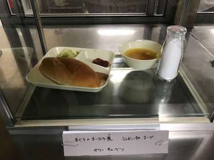 マグロのオーロラ煮、じゃがいものスープ、サワーキャベツ、パン、牛乳