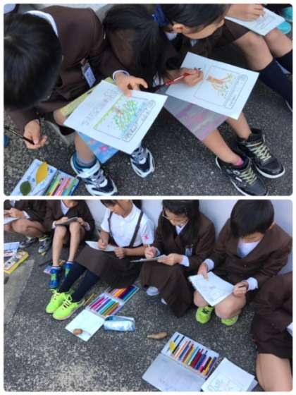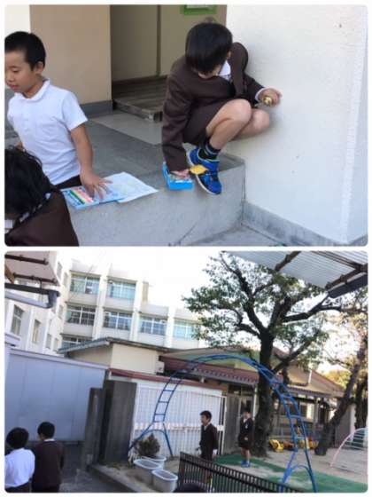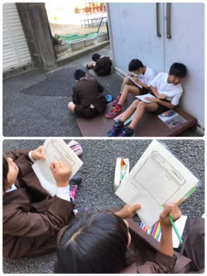 4年生はサクラやヘチマ、ひょうたんの観察をカードに書いて記録しています。