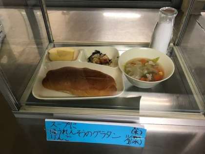 ほうれん草のグラタン、スープ煮、リンゴ、パン、牛乳