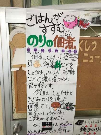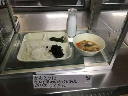 関東煮、三度豆のからしあえ、海苔の佃煮、ご飯、牛乳