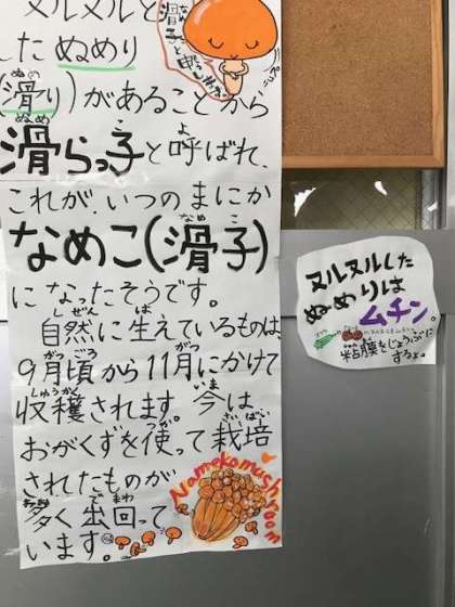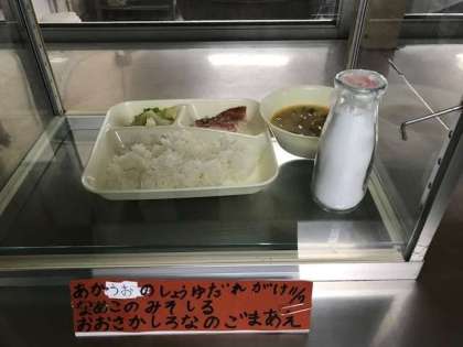 赤魚の醤油だれがけ、なめこの味噌汁、大阪白菜の胡麻和え、ご飯、牛乳
