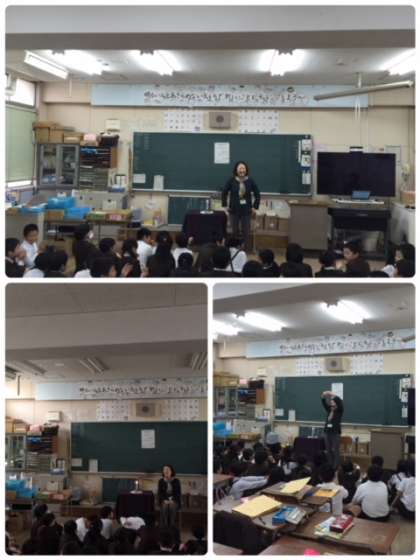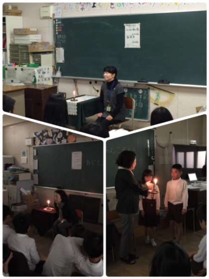 語り手を教室まで案内してくれた児童が、願い事を込めながら、ロウソクの火を消しました。