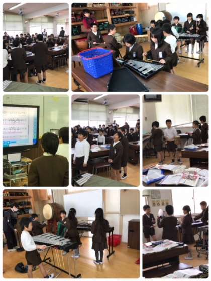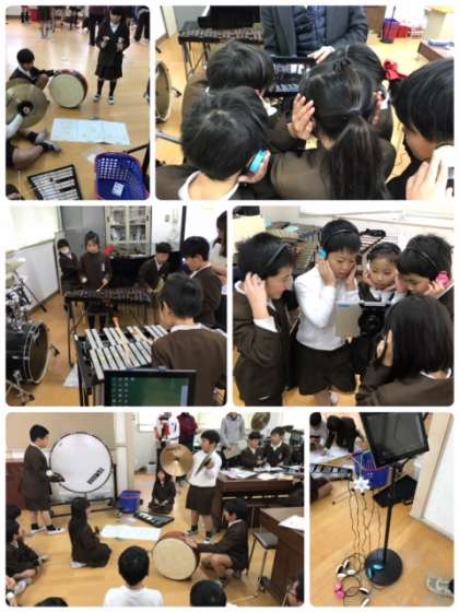 22日5時間目、3年1組が音楽室で研究授業を行いました。曲の途中に入れる魔法の音楽をグループでつくる、という学習でした。