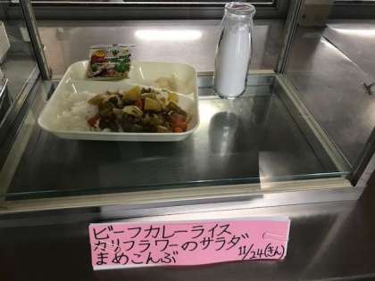 ビーフカレーライス、カリフラワーのサラダ、豆こんぶ、牛乳