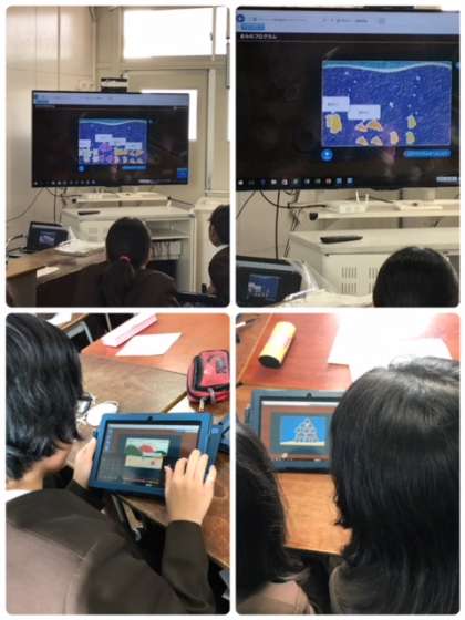 24日5時間目、6年2組が教室で研究授業を行いました。お話の世界に動く絵本を作ろうというプログラミング教育の授業でした。自分たちのイメージに合うように動くかどうか試行錯誤を繰り返していました。意見の交流も盛んに行われていました。