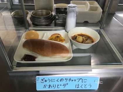 牛肉のケチャップ煮、かわりピザ、白桃、パン、牛乳