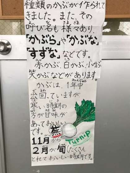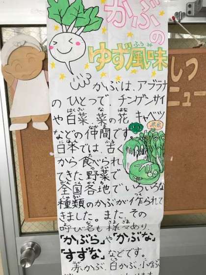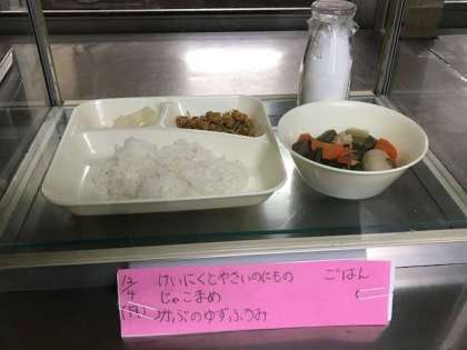 鶏肉と野菜の煮物、じゃこまめ、蕪の柚子風味、ご飯、牛乳
