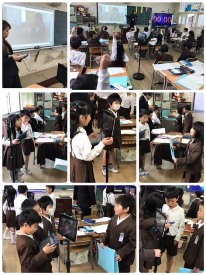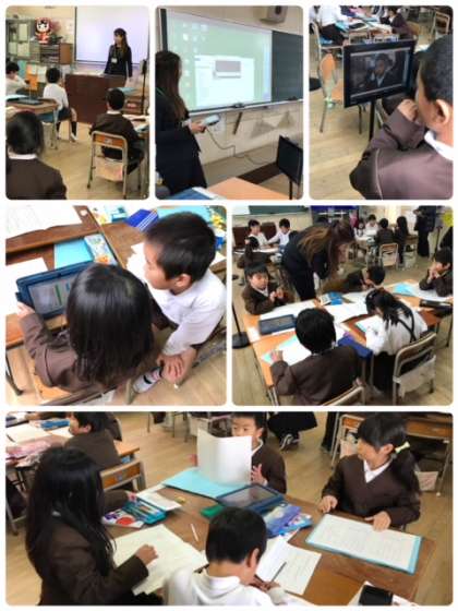 1年生は、国語科ですきなものクイズをしよう、という授業でした。クイズ大会を班ごとでする事で、話し方、聞き方の基礎基本を身につけました。タブレットは発表の様子を録画、再生して振り返り活動に役立てました。上手に活用したいました。