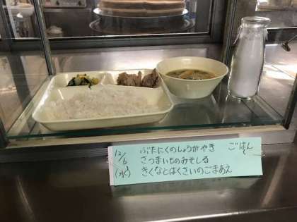 豚肉のしようが焼き、サツマイモの味噌汁、菊菜と白菜の胡麻和え、ご飯、牛乳