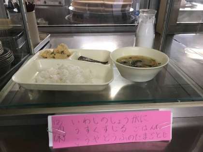 イワシの生姜煮、薄葛汁、高野豆腐の卵とじ、ご飯、牛乳