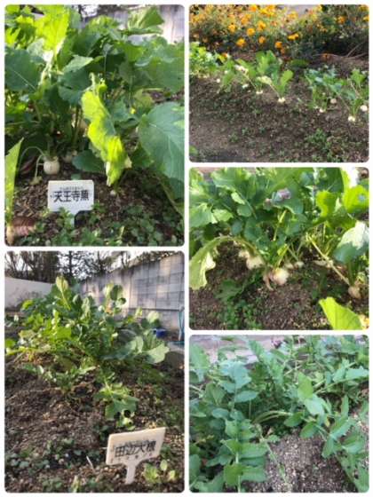 環境委員会の人が、なにわ伝統野菜の栽培をしていました。天王寺蕪と田辺大根です。
