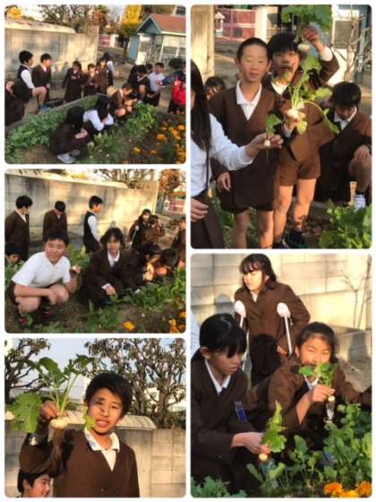 今日の委員会の時間に天王寺蕪を収穫しました。蕪は冬が旬の食材になります。美味しくいただきましょう。