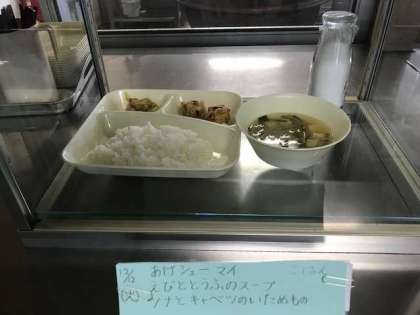 揚げシューマイ、海老と豆腐のスープ、ツナとキャベツの炒め物、ご飯、牛乳