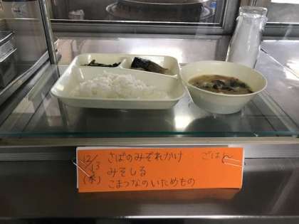 サバのみぞれかけ、小松菜の炒め物、味噌汁、ご飯、牛乳