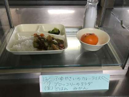 冬野菜のカレーライス、ブロッコリーのサラダ、みかん、牛乳