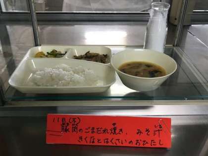 豚肉のゴマだれ焼き、味噌汁、菊菜と白菜のおひたし、ご飯、牛乳