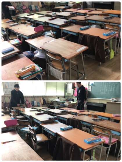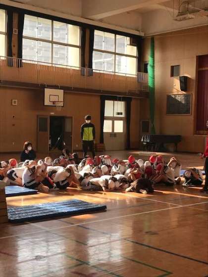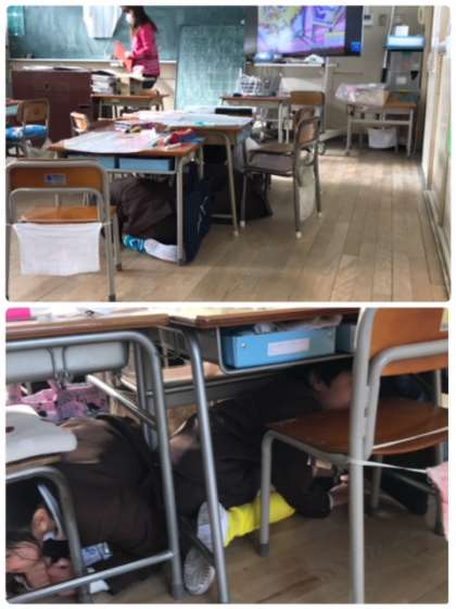 日本に向けてミサイルが発射されたという想定で、訓練しました。教室にいる場合は、机の下にもぐったり、講堂では真ん中に集まり頭を守ったりします。
