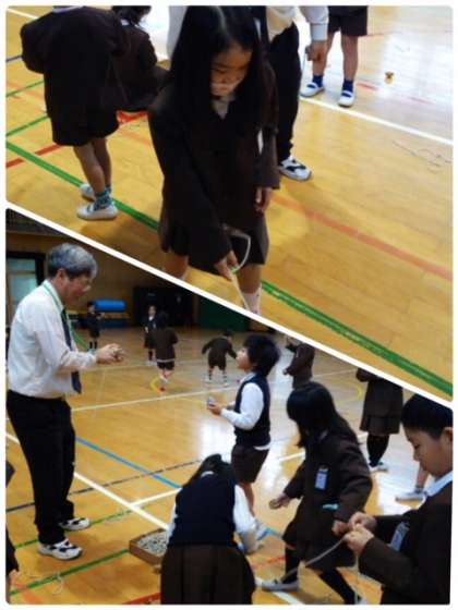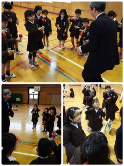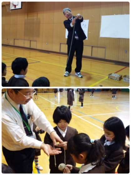 17日、1年生が昔遊びを講堂で体験しました。特別講師は校長先生です。けん玉とコマ回しに挑戦しました。しっかり話を聞いて少しずつ上手にできるようになり、とても嬉しそうでした。