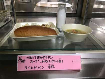 ホタテ貝のグラタン、スープ、和梨、ライ麦パン、牛乳