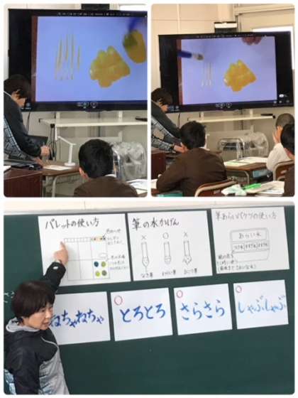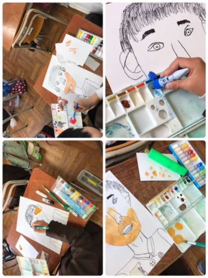 下山先生が、4年1組を使って、図工科の公開授業を行いました。自分の顔に色をつけるため、色の作り方を工夫する学習でした。画面で実際に説明していただいたのを見てから、パレットでしっかり色を作り、塗り方も工夫していました。