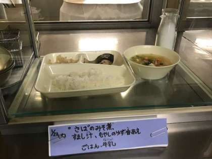 サバの味噌煮、すまし汁、もやしの柚子あえ、ご飯、牛乳