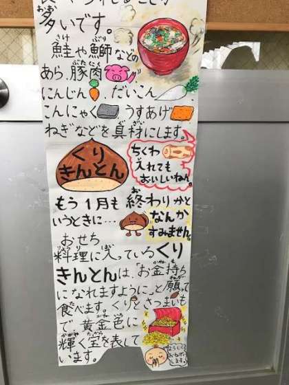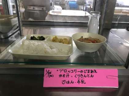 かす汁、ブロッコリーのごまあえ、栗きんとん、ご飯、牛乳