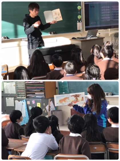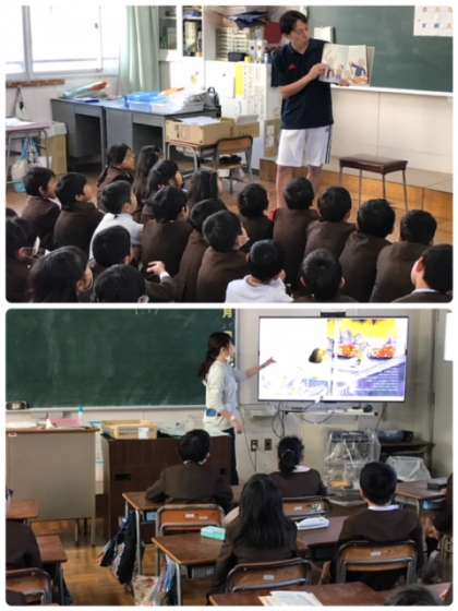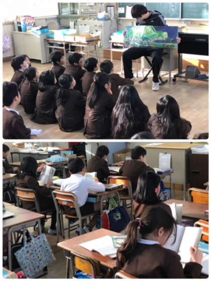 毎週木曜日は読書から始まります。低学年では、大型図書やモニターを使って、読み聞かせをしているクラスが多いです。もちろん、自分たちで黙って読むクラスもあります。